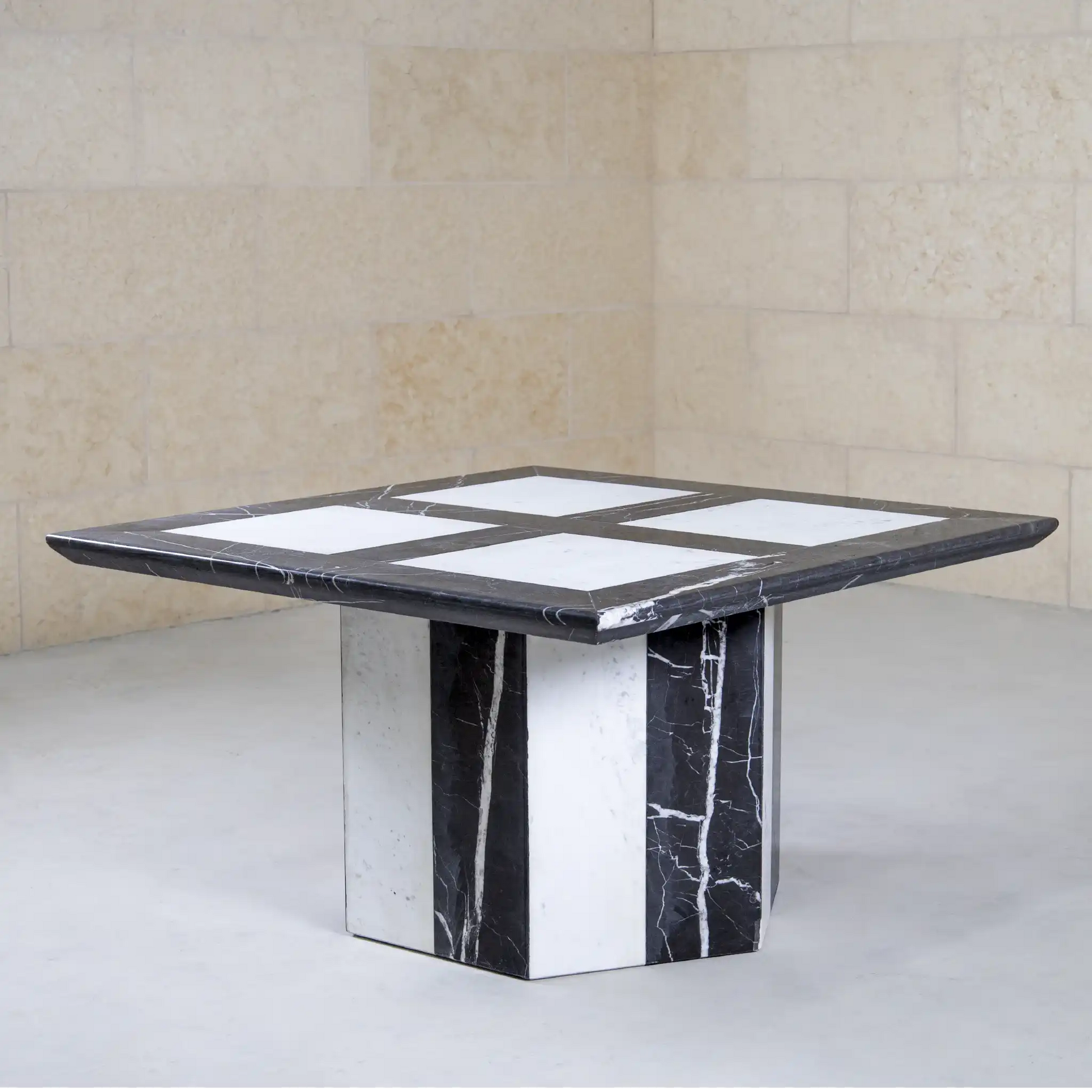 At the heart of its design lies a captivating pattern of four inner squares carved into the tabletop—a subtle yet artistic feature that adds depth, symmetry, and visual intrigue. Whether placed in a modern minimalist interior or a more luxurious setting, the Alina square marble table stands out as both a functional piece and a work of art.
