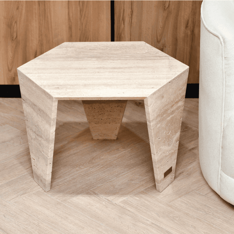 Whether placed in the center of your living room or as a statement piece in your elegant lounge, the Narwin Coffee Table in travertine marble is a testament to monticules craftsmanship and refined taste. Elevate your home decor with this masterpiece that harmoniously marries the enduring allure of natural stone with a contemporary, hexagonal twist.