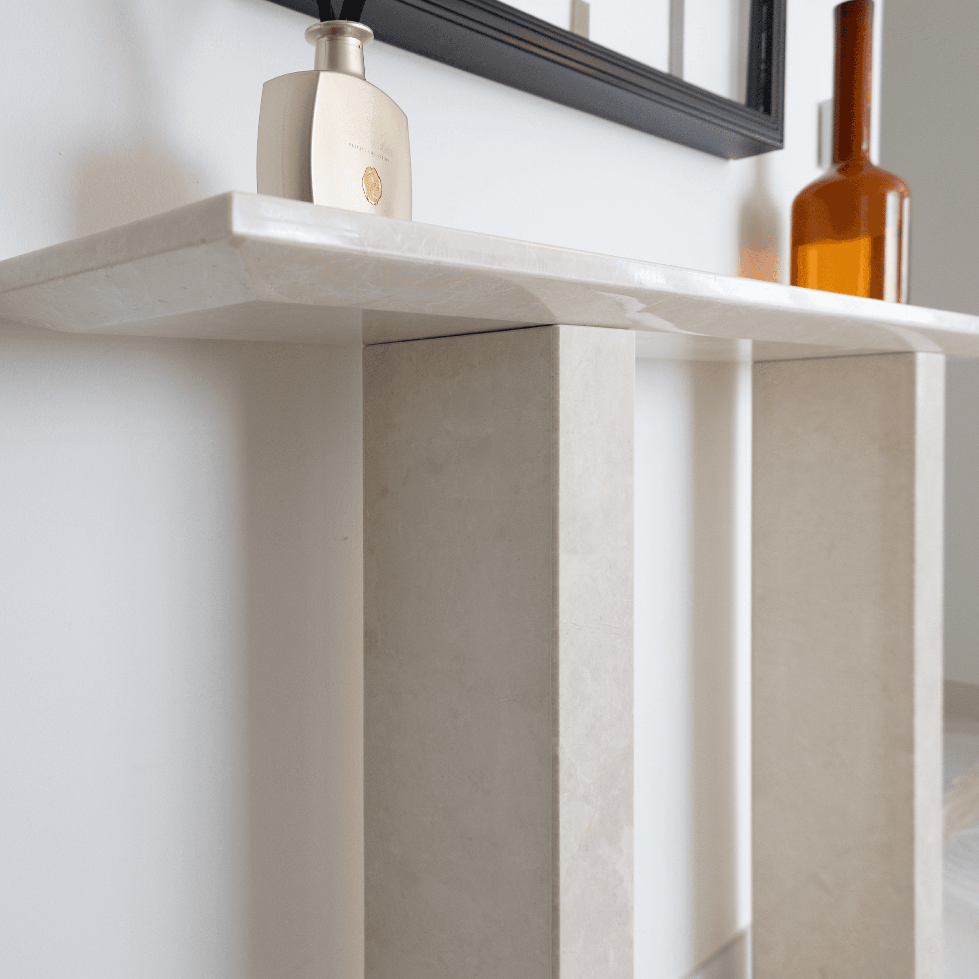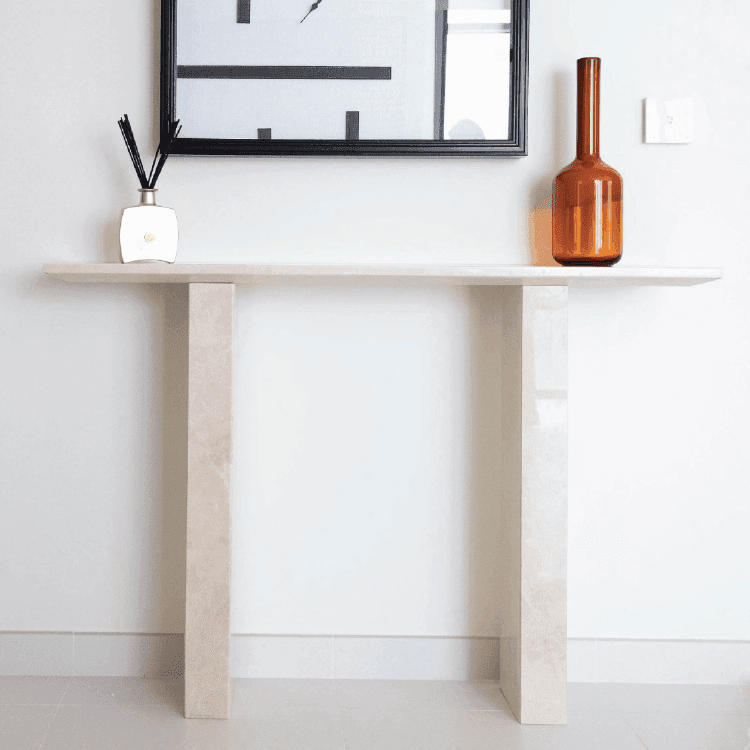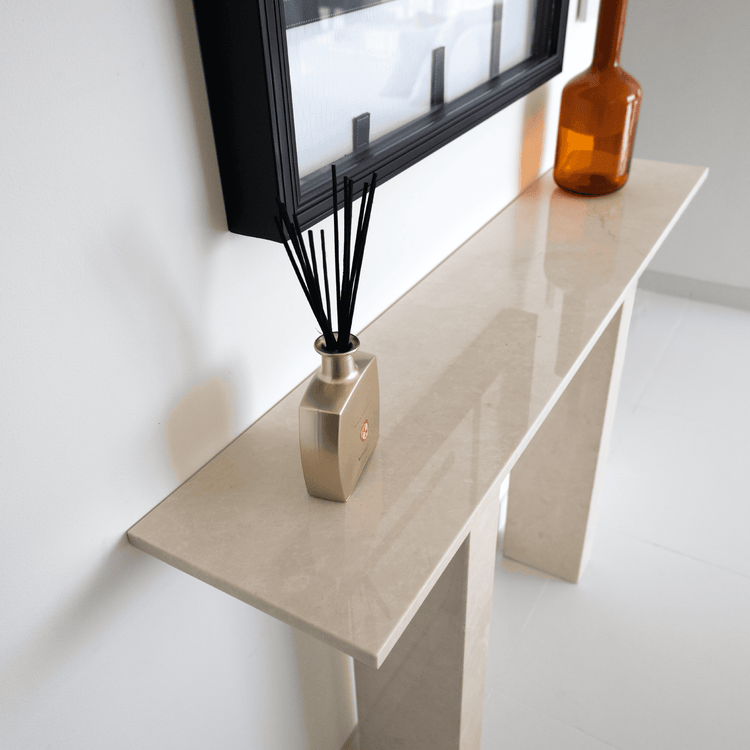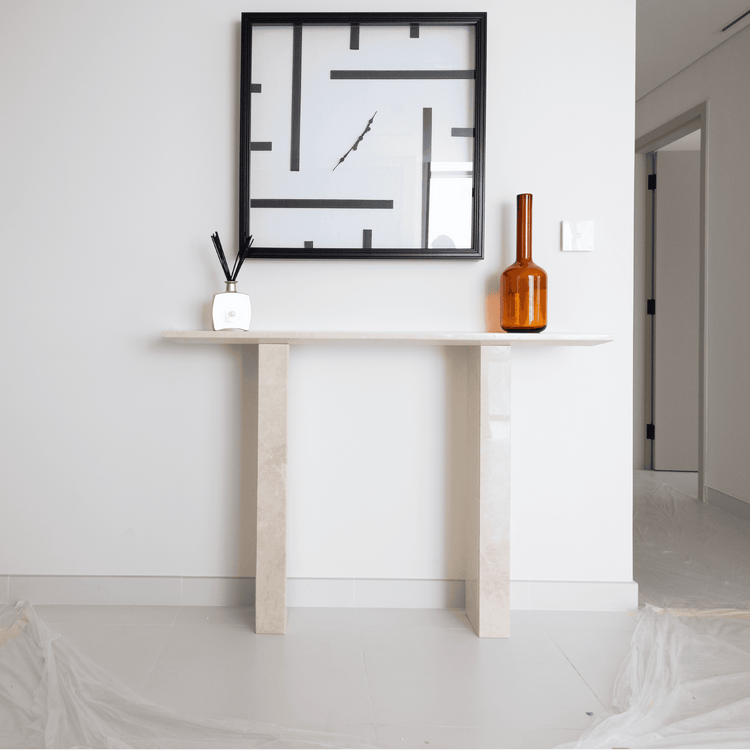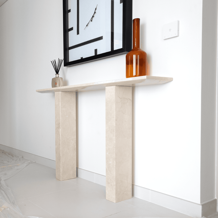 Designed to enhance a variety of spaces, this beige marble console table fits perfectly in entryways, living rooms, or hallways. Its refined shape allows it to complement other furniture while still making a statement. Use it as a focal point in your entryway to create a welcoming impression or place it in a hallway or living room to showcase decorative accents. The craftsmanship in this piece reflects attention to detail and an appreciation for quality. The marble's polished finish gives it a sleek, luxurious look that enhances any setting, while its minimalist legs create a contemporary aesthetic. This console table is more than just functional furniture it is a work of art that embodies understated luxury and refinement. Whether you are looking to add a subtle touch of elegance or create a statement in your decor, this beige marble console table offers a stylish and enduring choice for sophisticated interiors.