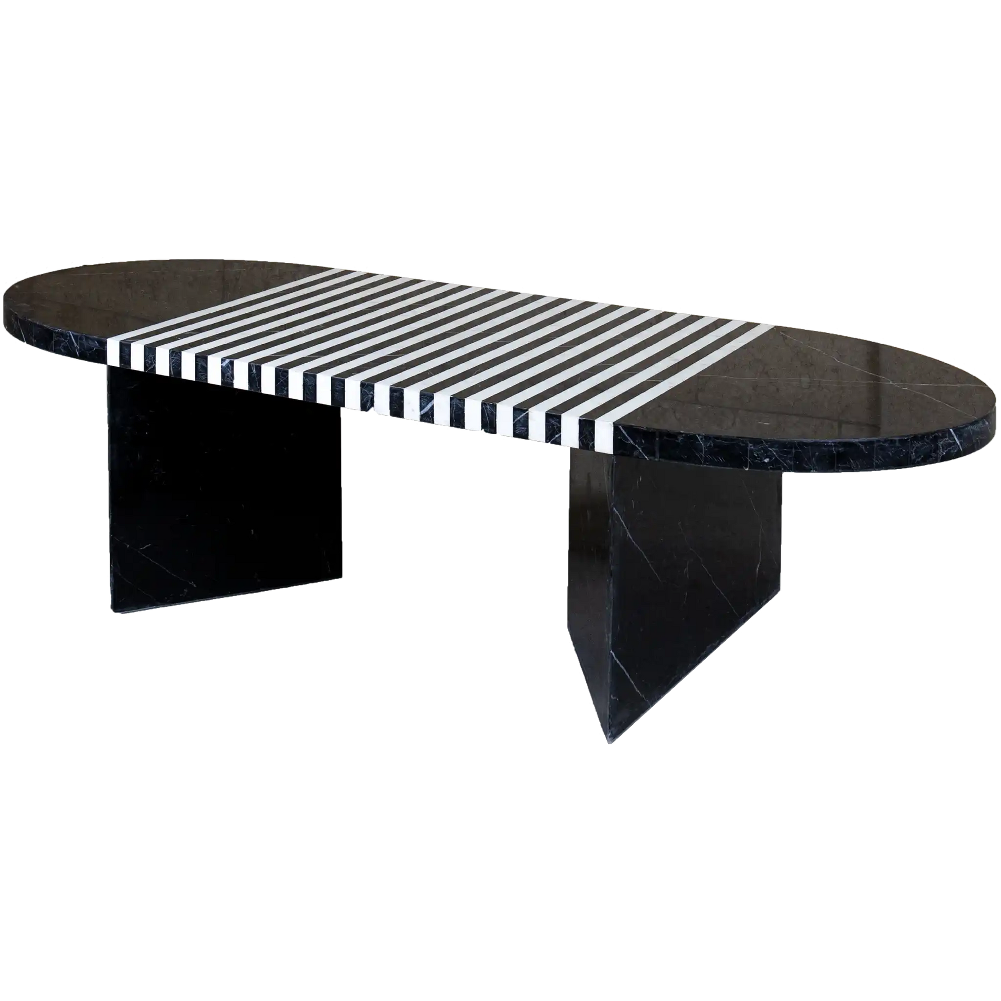 The smooth, polished marble top rests on two sculptural marble pedestal legs, offering both visual balance and lasting durability. These pedestals, carved from white marble, contrast beautifully with the darker top, adding dimension and depth to the design. This unique combination of black and white marble gives the table an architectural quality that suits both minimalist and upscale interiors.